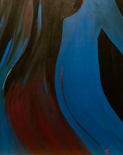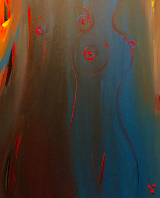 In this expressive artwork, the tree becomes an embodiment of femininity. The powerful, ascending structure takes on the form of a woman, seemingly merging with the landscape. Her silhouette emerges from the deep browns and reds in the upper part of the painting – the trunk as her body, firmly rooted in the ground yet rising in a flowing motion. The curved lines and dynamic expression of the branches resemble outstretched arms, as if embracing life or reaching toward the sky. The water surrounding her acts as a protective veil or a flowing dress, highlighting her gentle yet strong presence. The luminous shades of blue and green lend her grace and serenity, while the light that flows across the painting caresses her body, as if she glows from within. The tree-woman figure symbolizes life, fertility, and connection with nature. She is both steadfast and gentle, a bridge between earth and sky, between strength and fluidity. Her roots, deeply anchored in the water, symbolize deep emotions and inner stability. At the same time, her branches – or hair – seem to dance, carried by the movement of wind or time. Emotional Impact: This painting evokes a sense of maternal warmth, protection, and strength. It speaks of the unwavering presence of femininity, both silent and powerful. The viewer is invited to recognize the beauty in the connection between humanity and nature – an ode to women, who, like trees, are both rooted and free in their strength and grace.