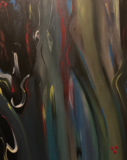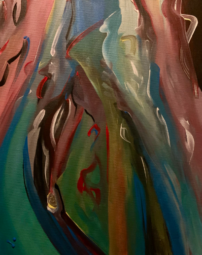 Das Bild zeigt eine beeindruckende Mischung aus kräftigen, lebendigen Farben, die eine dynamische und energiegeladene Atmosphäre vermitteln. Die abstrakte Komposition scheint sich auf das Spiel von Licht und Bewegung zu konzentrieren, wobei verschiedene Farben wie Grün, Blau, Rot und Pink miteinander verschmelzen und fließend ineinander übergehen. Diese gewagte Farbwahl und die fließenden Formen schaffen eine kraftvolle Darstellung von Emotionen und Bewegung, die den Betrachter in ihren Bann ziehen. Die Verwendung der Farben und die weichen Übergänge zwischen den Bereichen lassen eine gewisse Tiefe und Dimension im Werk entstehen, während die Formen an organische Strukturen erinnern könnten, die aus der Natur stammen. Die Arbeit könnte die Idee der Energie, der Transformation oder der Verbindung zwischen verschiedenen Elementen und Kräften darstellen. Sie ermutigt den Betrachter, eine persönliche Interpretation der Szene zu finden, wobei jede Farbe und Form unterschiedliche Emotionen und Assoziationen hervorrufen kann.