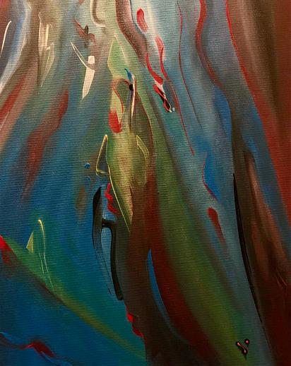 In this expressive artwork, the tree becomes an embodiment of femininity. The powerful, ascending structure takes on the form of a woman, seemingly merging with the landscape. Her silhouette emerges from the deep browns and reds in the upper part of the painting – the trunk as her body, firmly rooted in the ground yet rising in a flowing motion. The curved lines and dynamic expression of the branches resemble outstretched arms, as if embracing life or reaching toward the sky. The water surrounding her acts as a protective veil or a flowing dress, highlighting her gentle yet strong presence. The luminous shades of blue and green lend her grace and serenity, while the light that flows across the painting caresses her body, as if she glows from within. The tree-woman figure symbolizes life, fertility, and connection with nature. She is both steadfast and gentle, a bridge between earth and sky, between strength and fluidity. Her roots, deeply anchored in the water, symbolize deep emotions and inner stability. At the same time, her branches – or hair – seem to dance, carried by the movement of wind or time. Emotional Impact: This painting evokes a sense of maternal warmth, protection, and strength. It speaks of the unwavering presence of femininity, both silent and powerful. The viewer is invited to recognize the beauty in the connection between humanity and nature – an ode to women, who, like trees, are both rooted and free in their strength and grace.