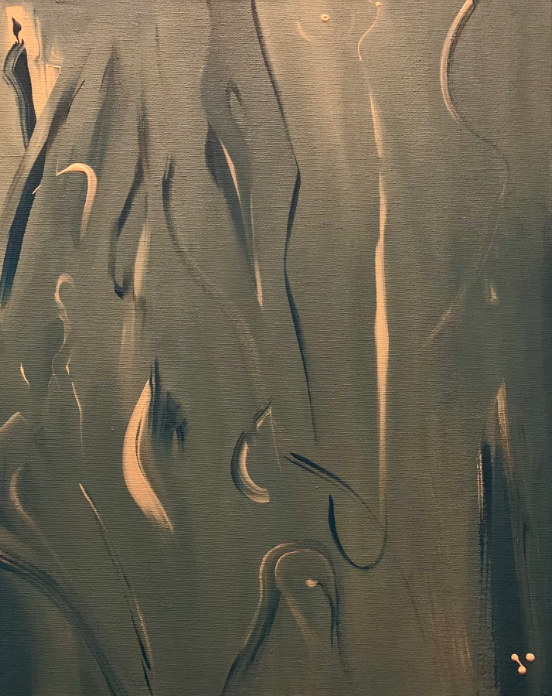 Dieses abstrakte Werk schafft eine ruhige und ätherische Atmosphäre mit fließenden, schwungvollen Pinselstrichen in Blau- und Weißtönen. Die Formen scheinen sich aus dem Hintergrund zu erheben und wieder in ihn zu verschwinden, was Bewegung in der Stille suggeriert. Die malerischen Striche sind sowohl zart als auch fein, lenken das Auge des Betrachters über die Leinwand, ohne eine definierte Struktur oder einen klaren Fokus. Der Minimalismus und die Verwendung kühler Farben rufen ein Gefühl von Geheimnis und Gelassenheit hervor, während die subtilen, organischen Formen vielleicht auf menschliche oder natürliche Gestalten hinweisen, wodurch eine leise Erzählung von Veränderung oder Introspektion entsteht. Dieses Gemälde fühlt sich an wie eine Meditation über den Verlauf der Zeit und die Fluidität der Existenz.